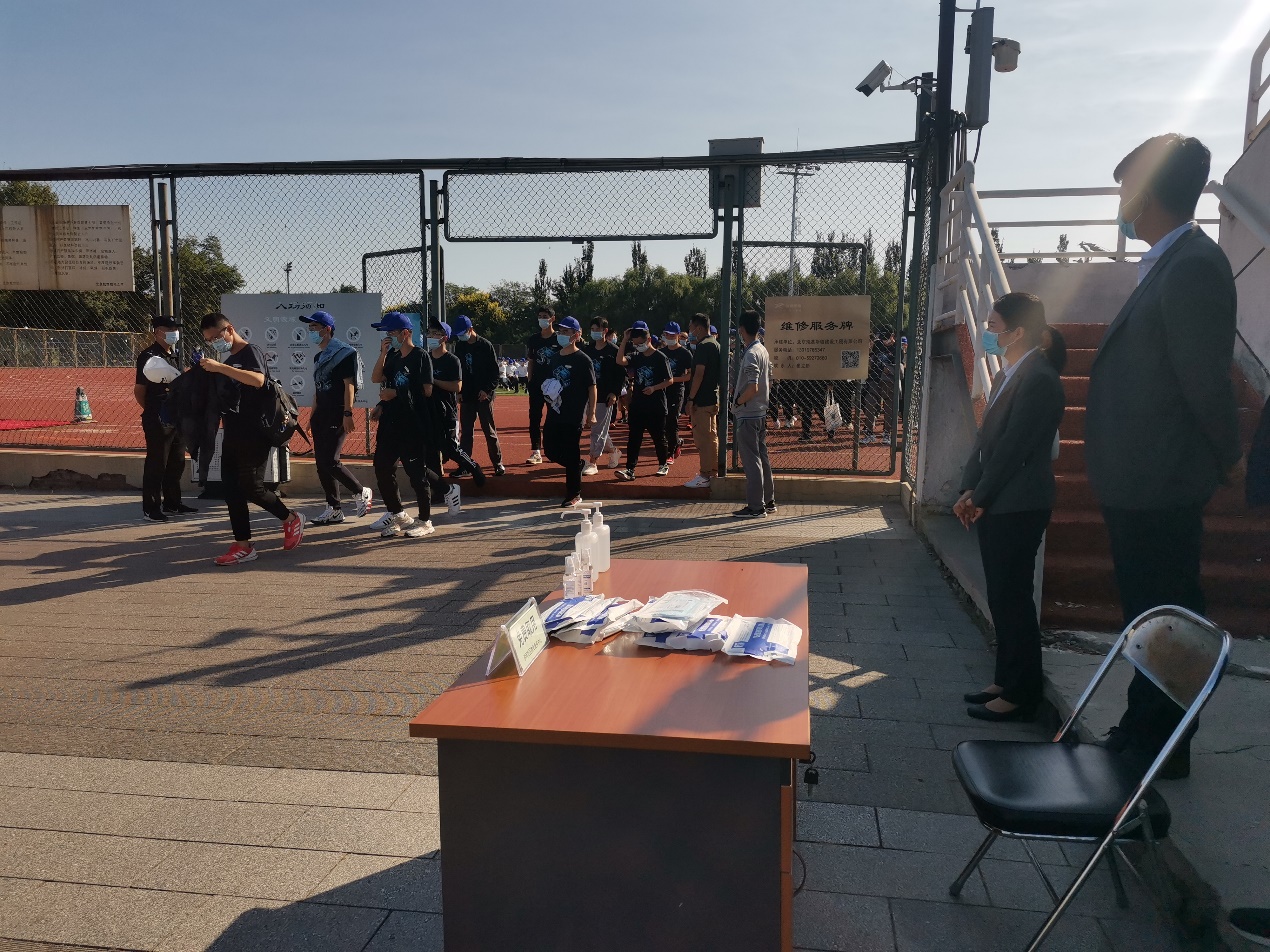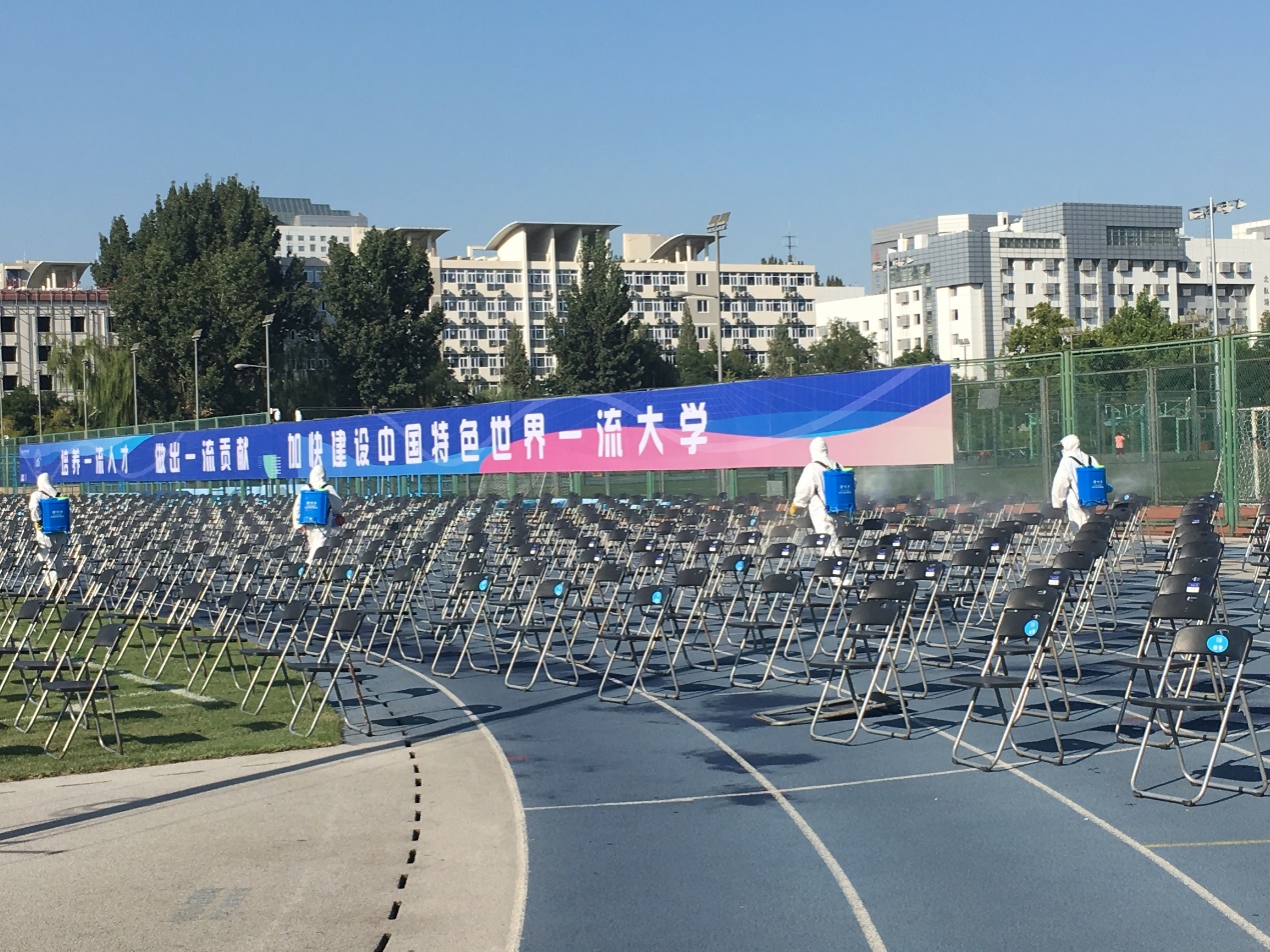 在开学典礼前组织人员对体育场内外环境进行全面清理保洁,对体育场内卫生间派保洁员全天不间断保洁;并对操场看台、主席台、学生座椅区、卫生间,以及典礼外环境进行全方位的消毒,确保参会师生安全。并为参会人员配备应急防疫物资,口罩2000个,手消500瓶,在两校区会场设立临时取用点,供应学生应急使用。同时为保障开学典礼现场供电系统正常运行,配备UPS应急照明车保障典礼现场的供电,并安排专业电工全天现场值守,确保万无一失。