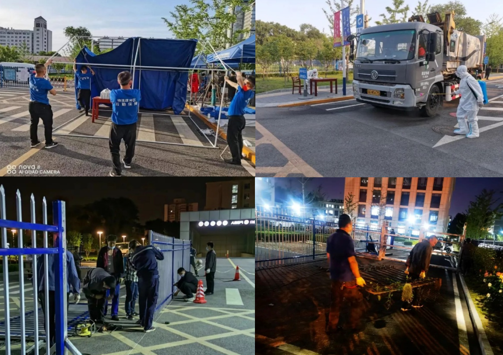 面对垃圾运输难题,社区物业开辟垃圾清运新思路。自5月14日起,由于校园防疫封闭每日生活垃圾无法清运至北区垃圾消纳站,社区物业及时改变思路,雇佣压缩车每日入家属区定时消纳垃圾,并在重点区域增设垃圾桶,有效缓解垃圾量猛增,桶站满冒现象。自5月18日起,重点区域消毒频次增加,从2次/日,增加至4次/日,西北门快递点要求每2小时消毒一次,仅此一项每日多增加消毒面积近2.08万平方米。社区物业服务中心按照学校疫情防控要求,进行核酸采样亭建设。工程部员工从5月23日晚22时至次日4时连夜奋战,仅用6个小时搭建完成3个社区核酸检测点。24日早8时全部投入使用。