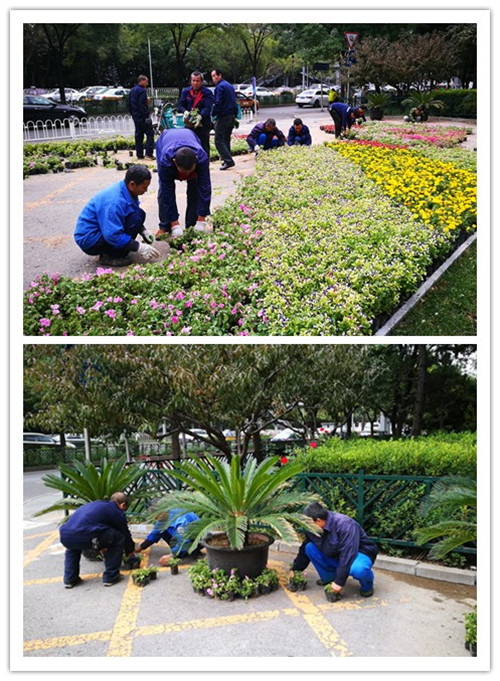 为迎接党的十九大的胜利召开以及北航65周年校庆的到来,按照后勤保障处领导的要求,对校东门进行花卉装饰。由于时间紧,且现正处于用花高峰期,花卉采购比较困难.物业中心接到任务,立即安排花坛摆放工作,联系花卉供应商,设计摆放方案,由于现在载货车辆检查的比较严格,送花的货车只能半夜来送,员工们卸花到了凌晨,第二天一大早就又开始花卉摆放工作。
