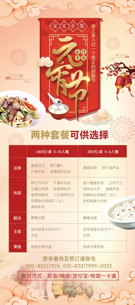 在这个团团圆圆的日子里,小编悄悄告诉你培训餐厅一直想着您,为了惠及广大师生,餐厅给您准备了两款团圆宴套餐,欢迎您惠顾!
