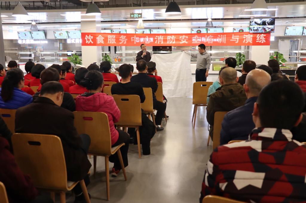 为进一步增强全员消防安全意识,提升应急处置能力,确保即将在我校举办的“挑战杯”竞赛顺利进行,饮食服务中心结合“119消防日”宣传教育计划,于11月6日下午,特邀保卫处消防科科长王庆华,在学六食堂为中心全体员工开展了消防安全专题培训及消防演练。
