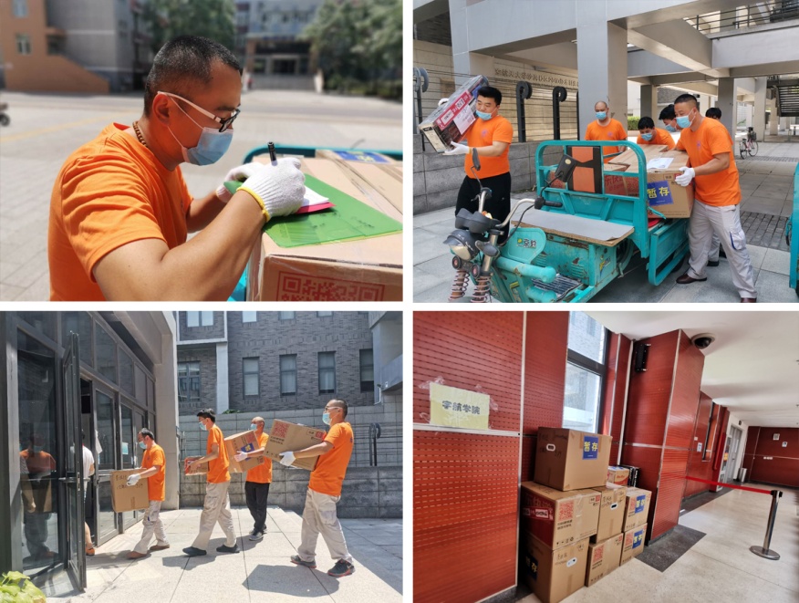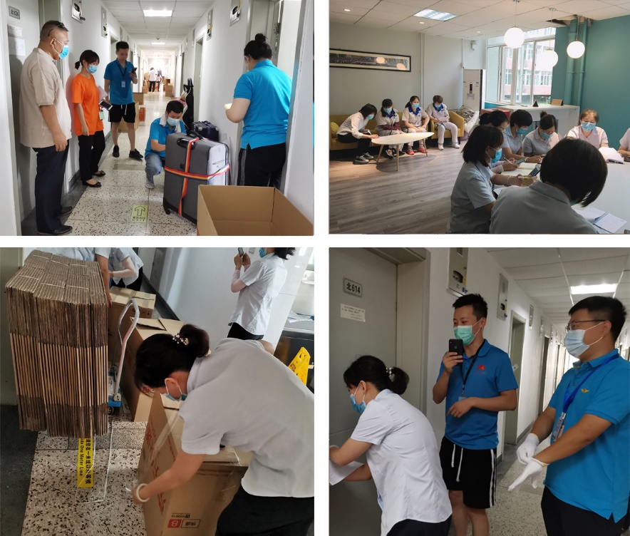 为保证搬运工作顺利进行,沙河物业服务中心已制定了详细的方案,部署各个环节。成立了搬运小组、物资保障组、监督检查组,设置了行李集散区、行李暂存点等,并安排专人负责。学生公寓班组成立了专项一对一的管家式服务,即一位楼管员对接一个学院,保证工作细化到每个环节,包括打包人员进楼测温、登记、与学院负责人确认学生委托打包责任书、提示打包人员把各种标签贴好、确认学生姓名及联系方式等等。为方便学生,管理员还准备了钥匙回收箱、图书回收箱等。做到了贴心提示,爱心服务!