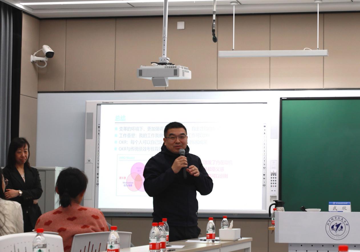 最后,后勤服务中心党委书记、主任高常忠进行了总结发言。他指出,武欣老师为后勤管理工作打开了一个新的视角, OKR管理对于培养团队合作精神、激发员工活力和创造力具有积极意义。他希望大家在工作中将所学知识灵活应用,不断改进和完善自己的OKR目标,努力提高后勤服务质量,为学校“双一流”建设提供一流的后勤服务保障。