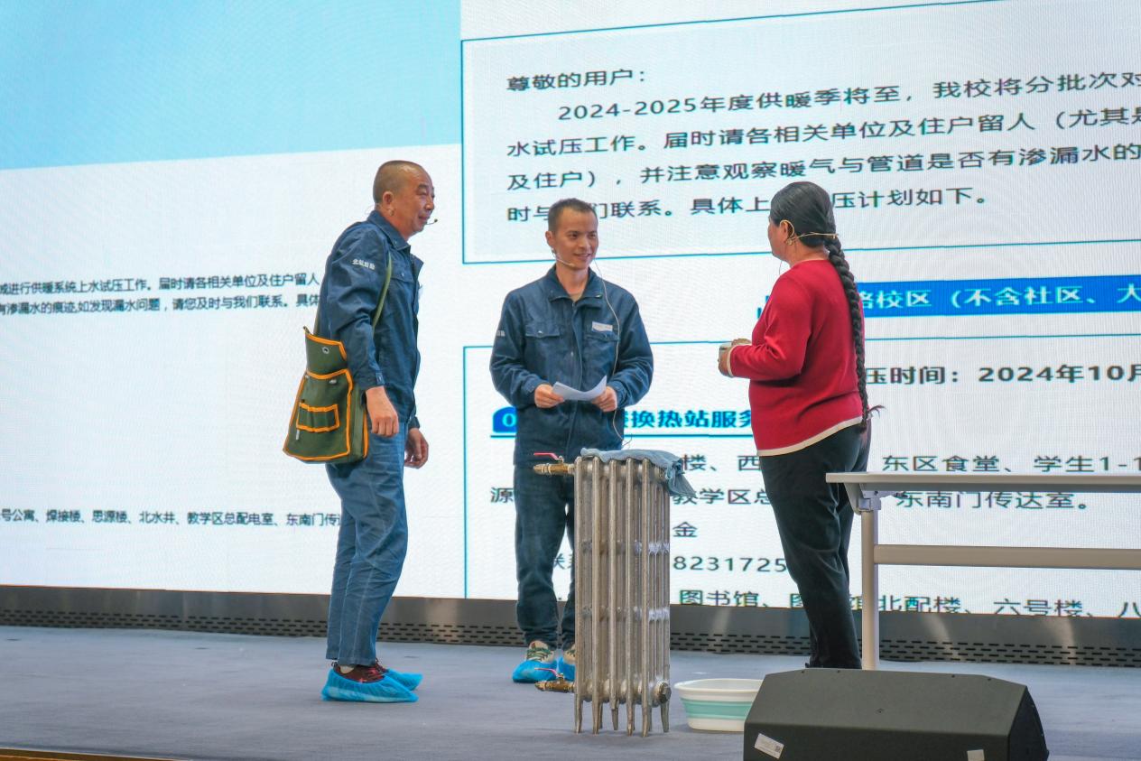 供暖师傅们通过《您的温暖,我们分秒必争》情景剧,模拟大年三十供暖抢修的紧急场景,诠释后勤人“辛苦我一人,温暖千万家”的动人服务精神。