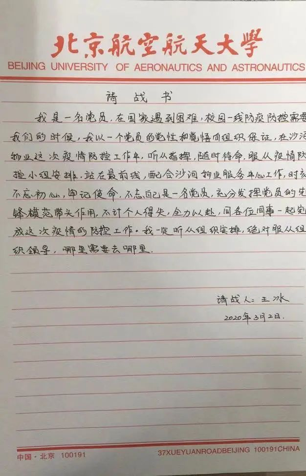 王冰对递交“请战书”的情景依然记忆深刻,当时学校已经封闭管控,她深知一旦递交了这份“请战书”,就会被派往一线,当时没有人知道疫情什么时候会被有效控制,一旦进入封闭的校园,不知道何时才能返回家中与家人团聚。但当她想到滞留在公寓楼内的那五十几位同学时,便义无反顾地选择了回到学生公寓,投身后勤抗疫一线。她说:“我在沙河校区工作9年了,从沙河校区开放我就在这里,对后勤和公寓管理这个岗位有着很深的感情。同时,作为一名党员要以身作则,如果我都不去,别人凭什么去?”