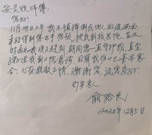 2020年12月5日,学一食堂收到一封感谢信,来信对学一食堂员工安灵欣表示了感谢。感谢信内容如下: 安灵欣师傅: 您好! 11月28日上午,我不慎摔倒在地,血流满面。幸好得到您出手相救,扶...